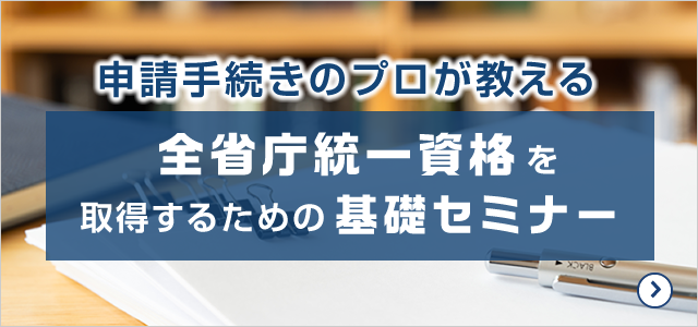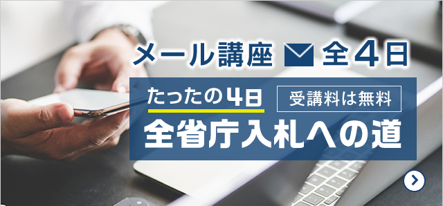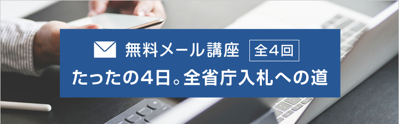 「全省庁統一資格を取得したい」「省や庁の入札案件に興味がある」「省庁の入札参加資格について、概略を知りたい」という方のために、無料のメール講座「たったの4日。全省庁への道。」を配信しています。「いますぐ、全省庁統一資格を取得したい」という人は、もちろんのこと、「今後のために、全省庁統一資格について、勉強しておきたい」という人や「いますぐ必要ないけど、いざという時のために知識を仕入れておきたい」という人でも、登録して頂くことができます。